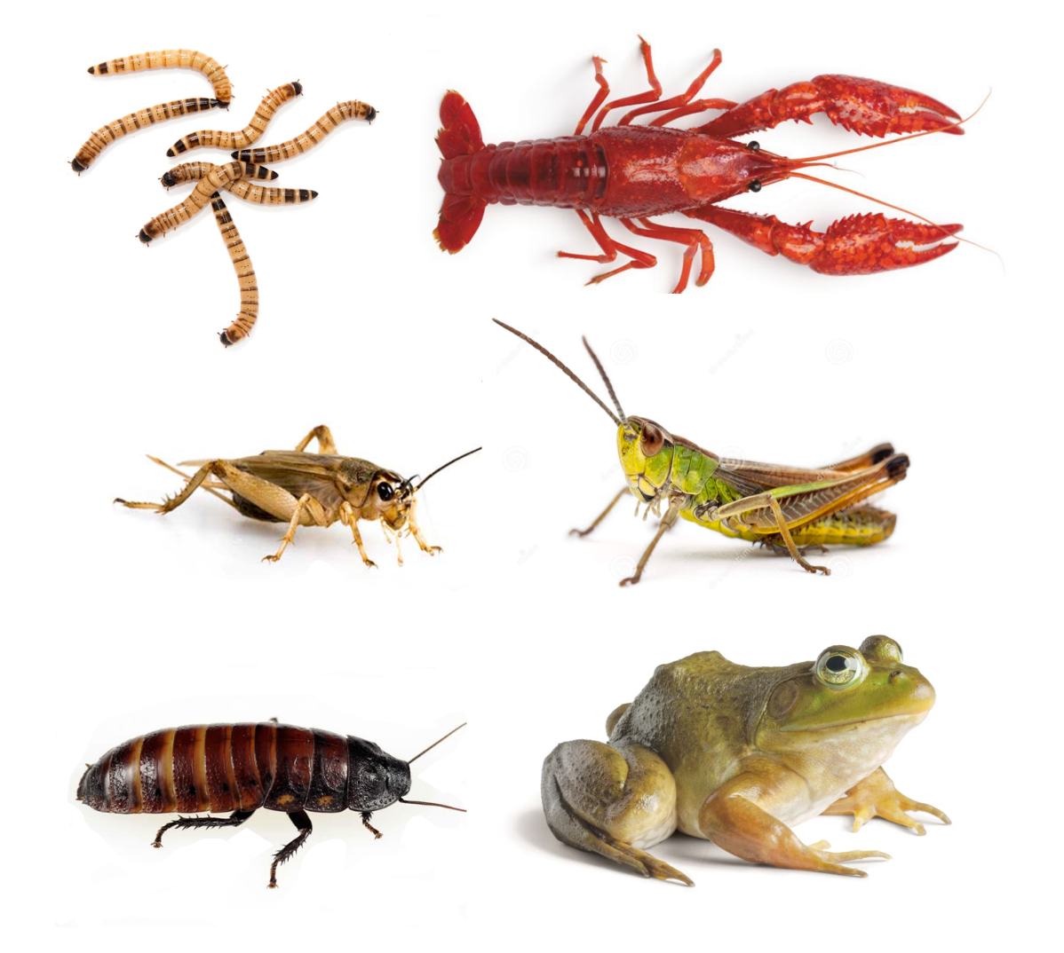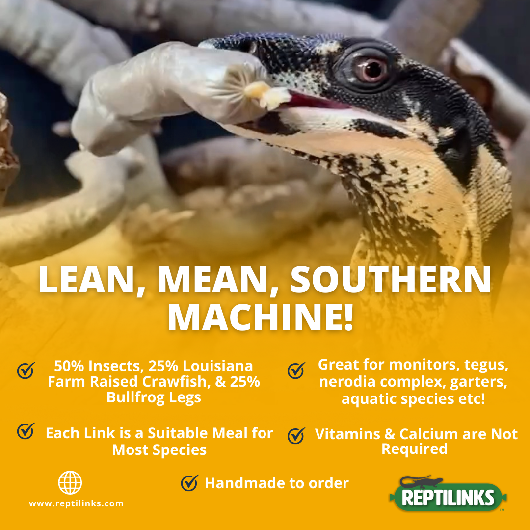 Ingredients: Lean, mean, southern machine! The Bayou-Blend contains 50% insects (hisser roaches, crickets, grasshoppers, superworms), 25% Louisiana farm raised crawfish and 25% bullfrog legs, in a 100% natural collagen casing.