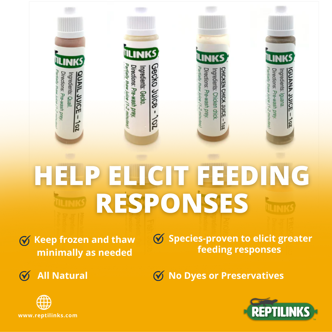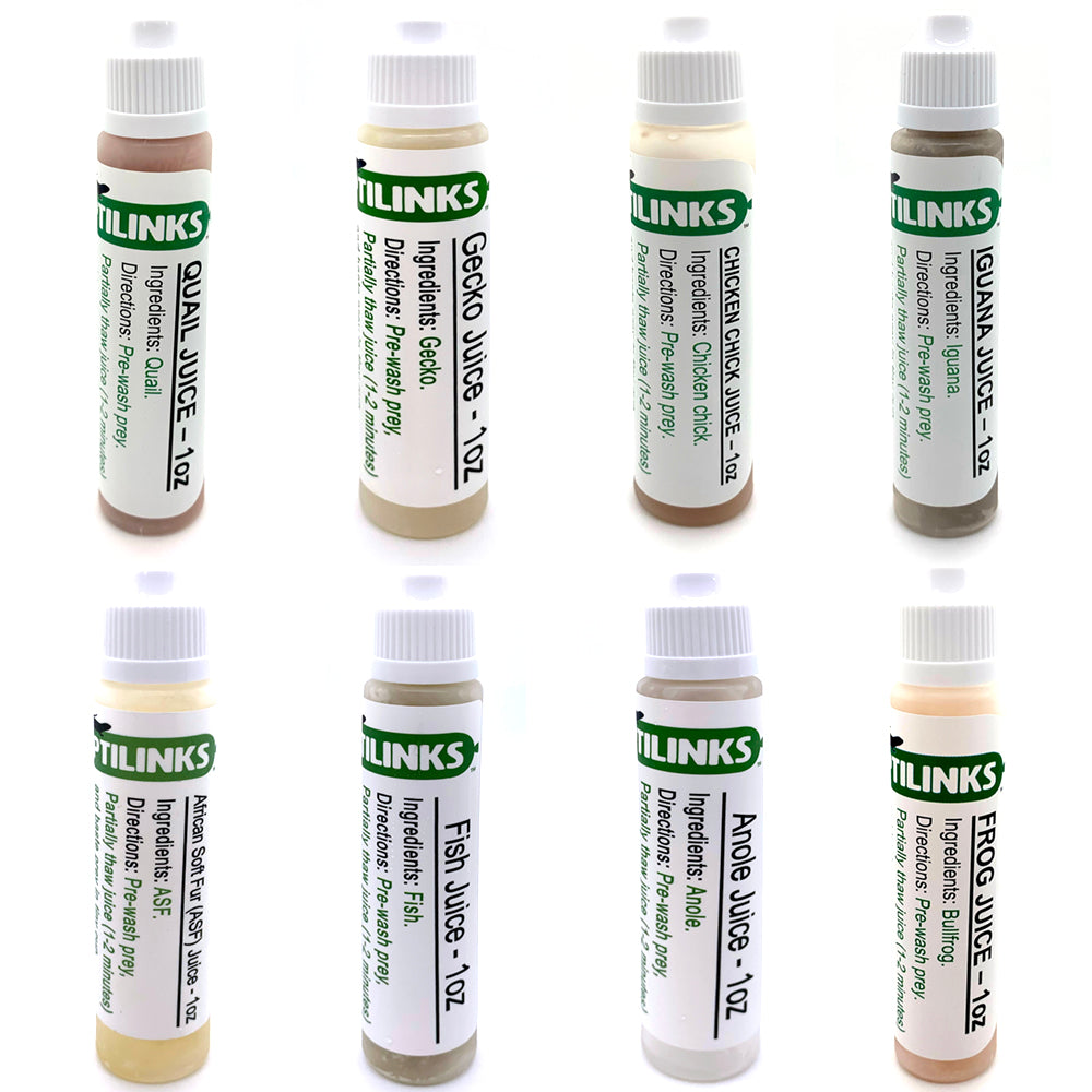 Gecko, Fish, Frog, Anole, Chicken Chick, Quail, Iguana, and ASF scented liquid. 1 oz bottle of each type (8 oz total). All natural with no dyes or preservatives. A must-have for any serious keeper. Sometimes you never know what will elicit a feeding response, and having every tool in your toolbox means more surviving animals. Species-proven to elicit greater feeding responses every time!